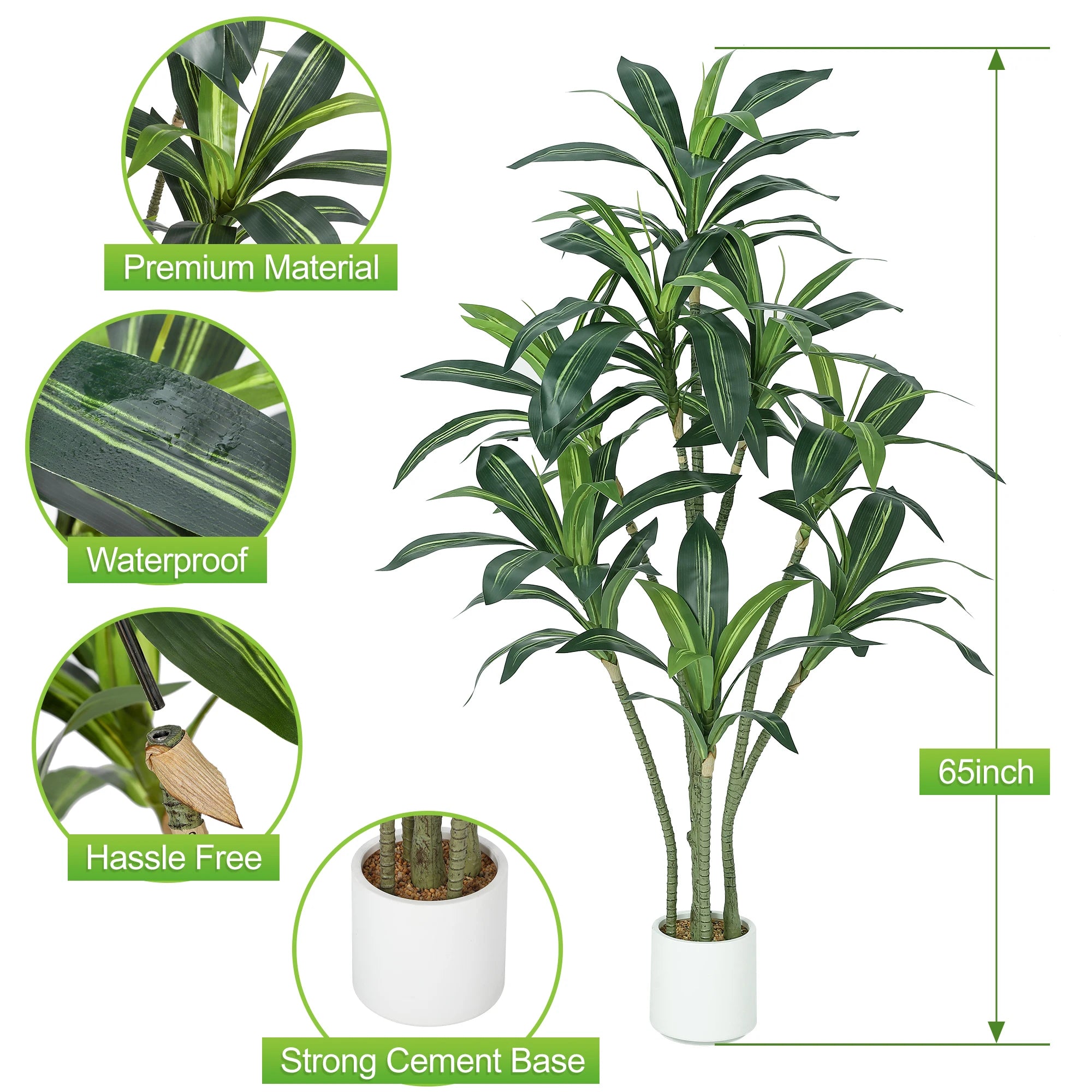 Enhance your home with the beauty of nature, minus the upkeep, with this realistic-looking artificial Dracaena plant. Standing 5.5 feet tall, it brings a touch of greenery to any space without the hassle of watering or maintenance. The lifelike leaves, made from premium polyester, are adjustable and can be shaped to your liking. Perfect for living rooms, offices, or commercial spaces, this faux plant adds a vibrant touch to your décor. Its sturdy, cement-filled pot ensures stability, even in high-traffic areas.