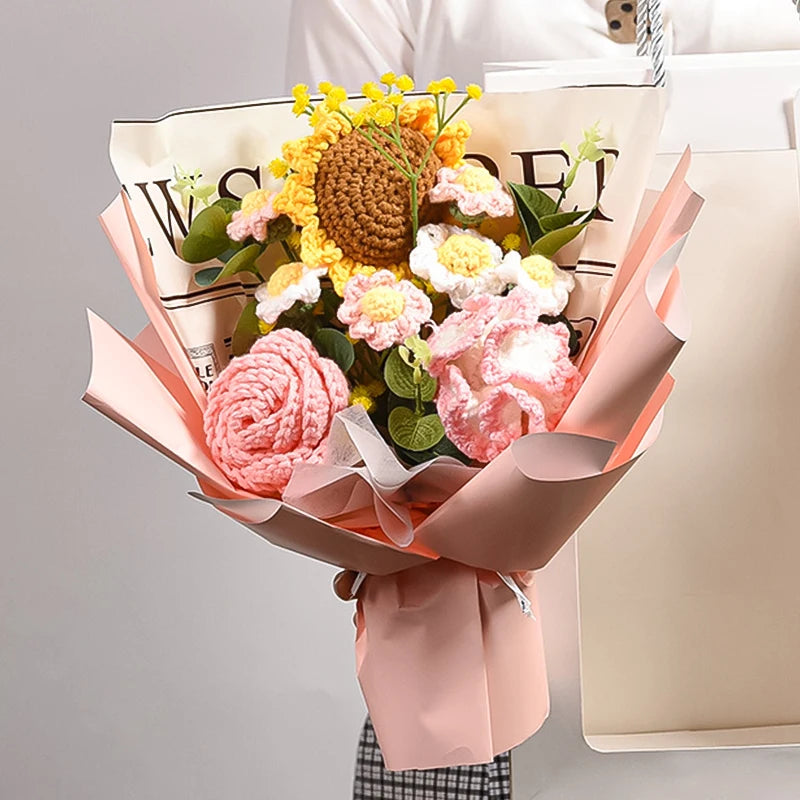 Add timeless elegance to your space with this beautifully crafted crocheted artificial flower bouquet. Designed to maintain its vibrant appearance, this bouquet is perfect for weddings, parties, home décor, and various other occasions. Encased in a stylish paper bag, it serves as a perfect gift or decoration piece, blending seamlessly into any environment.